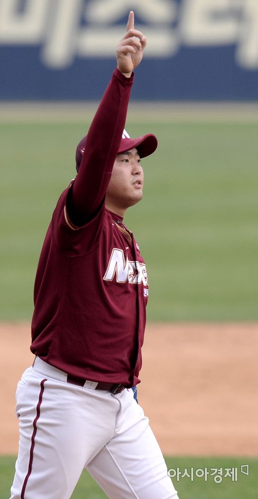 [잠실=아시아경제 김현민 기자] 프로야구 넥센 히어로즈와 두산 베어스의 2016 KBO리그 경기가 10일 서울 잠실구장에서 열렸다. 넥센 마무리 김세현이 9회말 2사 2루에서 두산 민병헌의 뜬공 타구를 가리키고 있다.