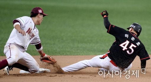 [고척돔=아시아경제 김현민 기자] 프로야구 kt 위즈와 넥센 히어로즈의 2016 KBO리그 경기가 12일 서울 양천구 고척스카이돔에서 열렸다. 6회초 2사 1루에서 kt 유한준 타석 때 도루를 시도한 1루주자 하준호가 넥센 2루수 서건창에 태그아웃되고 있다.