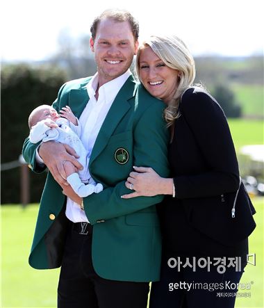 마스터스 우승자 대니 윌렛(잉글랜드)이 14일(한국시간) 잉글랜드로 돌아가 린드릭골프장에서 아내 니콜, 아들과 함께 기념 촬영을 하고 있는 장면이다. 니콜의 출산 예정일이 마스터스기간과 겹쳐 막판까지 고민하다가 다행히 지난 1일 아들을 순산해 가벼운 마음으로 등판했고, 생애 첫 메이저 우승을 일궈냈다. 윌렛에게는 열흘 일찍 태어난 아들이 '복덩이'가 된 셈이다.