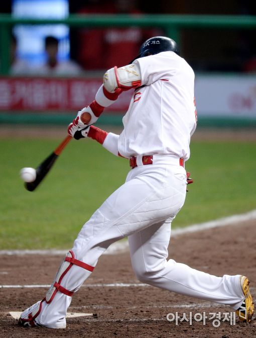 [인천=아시아경제 김현민 기자] 프로야구 KIA 타이거즈와 SK 와이번스의 2016 KBO리그 경기가 14일 인천 문학구장에서 열렸다. 3회말 1사에서 SK 김강민이 좌전 안타를 치고 있다.