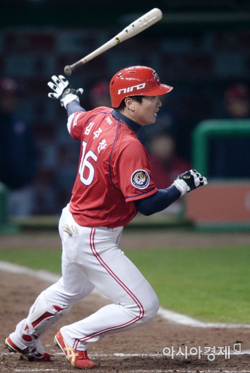 [인천=아시아경제 김현민 기자] 프로야구 KIA 타이거즈와 SK 와이번스의 2016 KBO리그 경기가 14일 인천 문학구장에서 열렸다. 7회초 2사 만루에서 KIA 김주찬이 추가 2타점 적시타를 치고 있다.