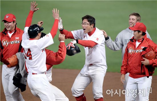 [인천=아시아경제 김현민 기자] 프로야구 KIA 타이거즈와 SK 와이번스의 2016 KBO리그 경기가 14일 인천 문학구장에서 열렸다. 9회말 1사 1,2루에서 SK 박정권이 좌익수 키를 넘기는 끝내기 안타를 치고 동료들과 기뻐하고 있다.