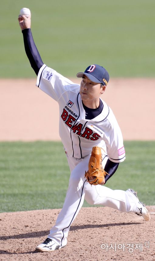 [잠실=아시아경제 김현민 기자] 프로야구 삼성 라이온즈와 두산 베어스의 2016 KBO리그 경기가 17일 잠실구장에서 열렸다. 8회초 두산 선발 보우덴에 이어 마운드에 오른 정재훈이 역투하고 있다.
