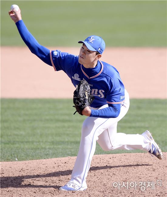 [잠실=아시아경제 김현민 기자] 프로야구 삼성 라이온즈와 두산 베어스의 2016 KBO리그 경기가 17일 잠실구장에서 열렸다. 7회말 삼성 구원투수 장필준이 역투하고 있다.