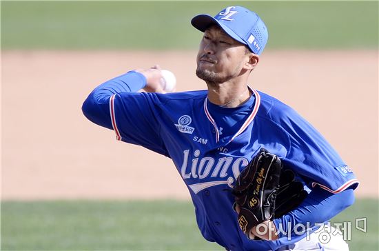 [잠실=아시아경제 김현민 기자] 프로야구 삼성 라이온즈와 두산 베어스의 2016 KBO리그 경기가 17일 잠실구장에서 열렸다. 8회말 삼성 구원투수 권오준이 역투하고 있다.