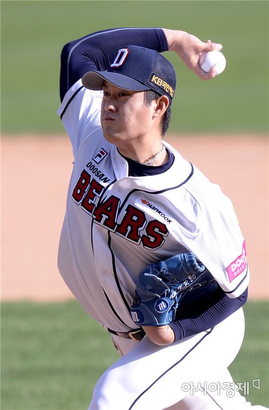 [잠실=아시아경제 김현민 기자] 프로야구 삼성 라이온즈와 두산 베어스의 2016 KBO리그 경기가 17일 잠실구장에서 열렸다. 9회초 두산 구원투수 김강률이 역투하고 있다.
