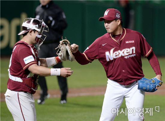 [문학=아시아경제 김현민 기자] 프로야구 넥센 히어로즈와 SK 와이번스의 2016 KBO리그 경기가 19일 인천 문학구장에서 열렸다. 넥센 마무리 김세현이 팀의 3-1 승리를 확정한 뒤 박동원 포수와 하이파이브하고 있다.