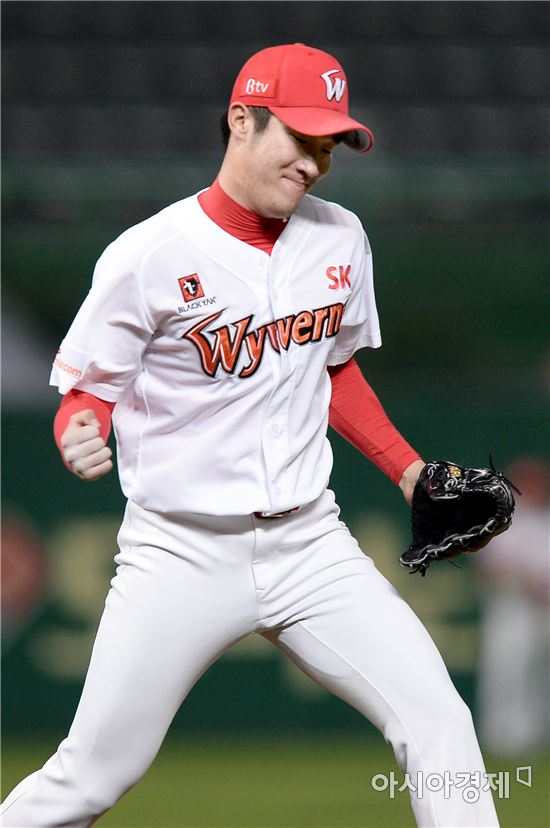 [문학=아시아경제 김현민 기자] 프로야구 넥센 히어로즈와 SK 와이번스의 2016 KBO리그 경기가 21일 인천 문학구장에서 열렸다. SK 선발투수 박종훈이 5회초 2사 1루에서 넥센 김민성을 삼진으로 처리한 뒤 주먹을 불끈 쥐고 있다.