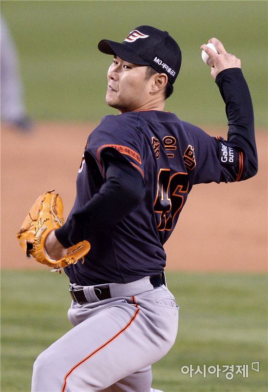 [잠실=아시아경제 김현민 기자] 프로야구 한화 이글스와 두산 베어스의 2016 KBO리그 경기가 22일 잠실구장에서 열렸다. 한화 선발투수 송은범이 역투하고 있다.