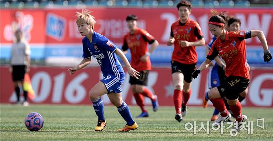 [효창=아시아경제 김현민 기자] 여자축구 2016 WK리그 서울시청과 인천현대제철의 경기가 25일 서울 효창운동장에서 열렸다. 현대제철 유영아가 상대 수비를 뚫고 공격하고 있다.
