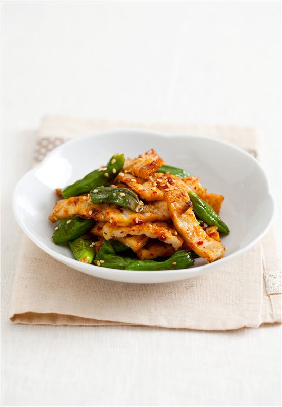 2. 프라이팬을 달구어 식용유를 두르고 꽈리고추를 넣어 볶다가 어묵을 넣는다.