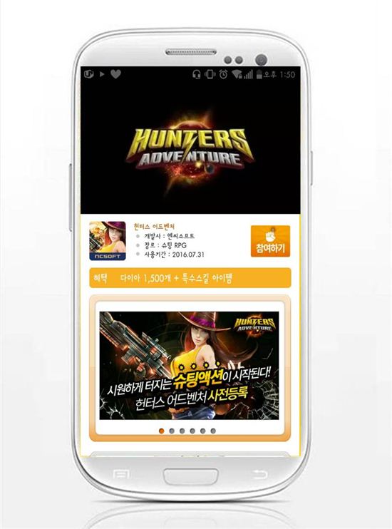 이번에 추가된 사전 등록 쿠폰은 신작 모바일슈팅 액션 RPG(Role Playing Game, 롤플레잉 게임)'헌터스 어드벤처' 쿠폰으로 등록하면 다이아 1천5백 개와 특수 스킬 아이템으로 구성된 특별한 혜택을 지급한다.