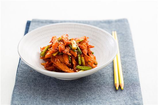 3. 북어채에 양념장을 넣어 버무린 다음 실파를 넣어 버무린다.
