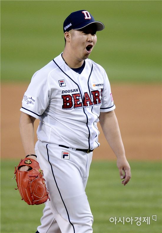 [잠실=아시아경제 김현민 기자] 프로야구 SK 와이번스와 두산 베어스의 2016 KBO리그 경기가 28일 잠실구장에서 열렸다. 두산 선발 유희관이 2회초 2사 1,2루에서 SK 김강민을 삼진으로 처리한 뒤 기뻐하고 있다.