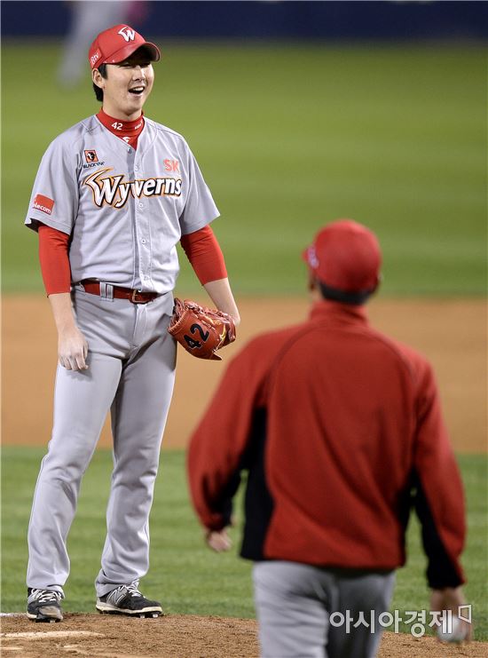 [잠실=아시아경제 김현민 기자] 프로야구 SK 와이번스와 두산 베어스의 2016 KBO리그 경기가 28일 잠실구장에서 열렸다. SK 선발 문승원이 6회말 1사 2,3루에서 두산 양의지에게 동점 1타점 적시타를 허용한 뒤 강판되고 있다.