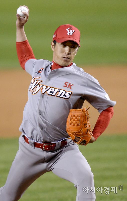 [잠실=아시아경제 김현민 기자] 프로야구 SK 와이번스와 두산 베어스의 2016 KBO리그 경기가 28일 잠실구장에서 열렸다. 6회말 SK 선발 문승원에 이어 마운드에 오른 김승회가 역투하고 있다.