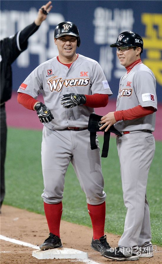 [고척돔=아시아경제 김현민 기자] 프로야구 SK 와이번스와 넥센 히어로즈의 2016 KBO리그 경기가 29일 서울 양천구 고척스카이돔에서 열렸다. 4회초 1사 1,3루에서 SK 이재원이 역전 1타점 적시타를 치고 출루한 뒤 박진만 코치와 미소짓고 있다.