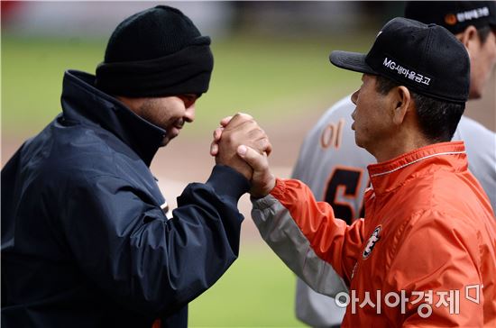 [문학=아시아경제 김현민 기자] 프로야구 한화 이글스와 SK 와이번스의 2016 KBO리그 경기가 3일 인천 문학구장에서 열렸다. 7-2로 승리를 거둔 한화 김성근 감독이 만루 홈런을 치며 활약한 로사리오와 하이파이브하고 있다.
