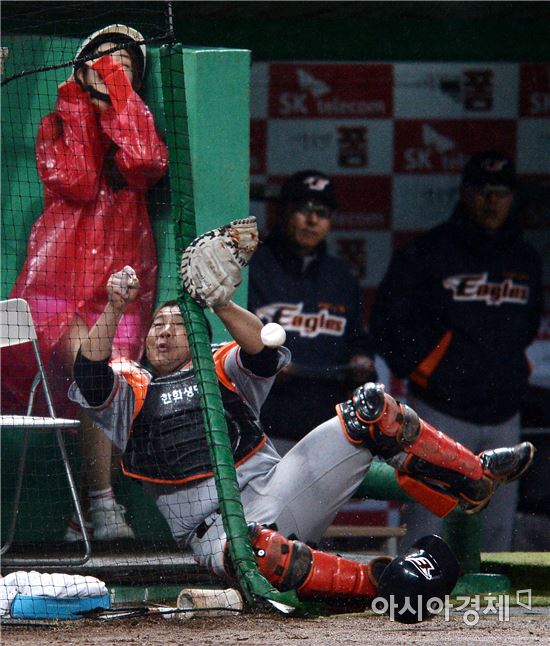 [문학=아시아경제 김현민 기자] 프로야구 한화 이글스와 SK 와이번스의 2016 KBO리그 경기가 3일 인천 문학구장에서 열렸다. 6회말 1사 1루에서 한화 허도환 포수가 SK 박정권의 파울타구를 잡으려다 그물에 걸려 넘어지고 있다.