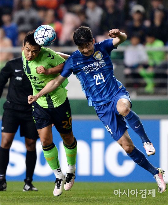 [전주=아시아경제 김현민 기자]2016 AFC 챔피언스리그(ACL) 전북 현대와 장쑤 쑤닝(중국)과의 조별리그 6차전이 4일 전주월드컵경기장에서 열렸다. 전북 이동국이 상대와 공중볼을 다투고 있다.