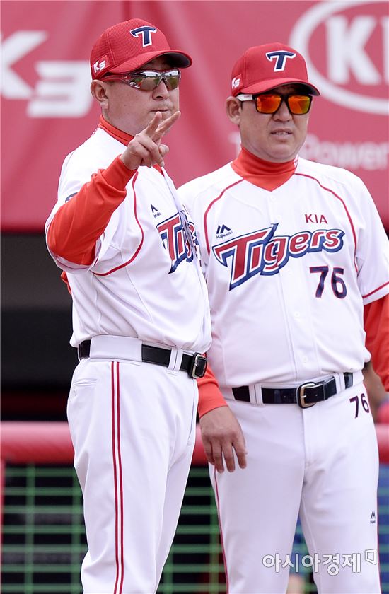 [광주=아시아경제 김현민 기자] 프로야구 롯데 자이언츠와 KIA 타이거즈의 2016 KBO리그 경기가 어린인날인 5일 광주구장에서 열렸다. KIA 김기태 감독이 4회말 2사 1루에서 대주자를 기용하고 있다.