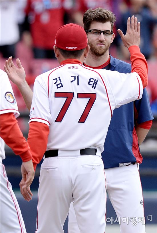 [광주=아시아경제 김현민 기자] 프로야구 롯데 자이언츠와 KIA 타이거즈의 2016 KBO리그 경기가 어린인날인 5일 광주구장에서 열렸다. 17-1 승리로 시즌 3승을 챙긴 KIA 선발 지크가 김기태 감독과 세리머니하고 있다.