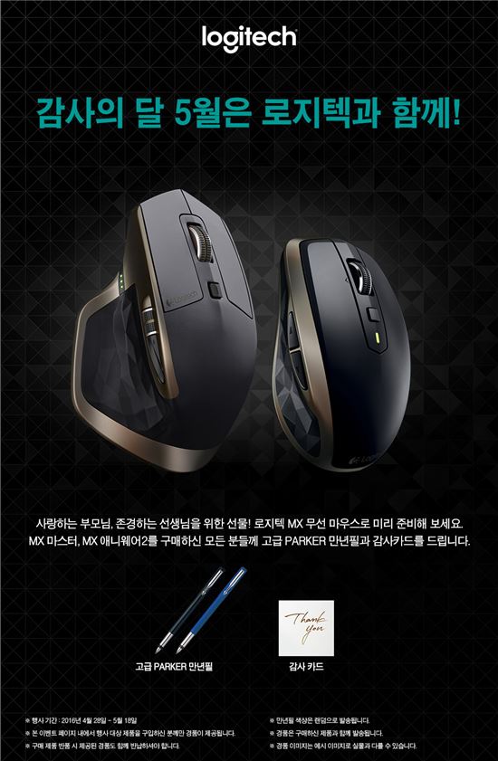 [아시아경제 김유리 기자] 로지텍 코리아는 감사의 달 5월을 맞아 로지텍 MX 무선 마우스 2종 구매 고객 전원에게 사은품을 증정하는 '감사의 달 5월은 로지텍과 함께' 프로모션을 진행한다.
