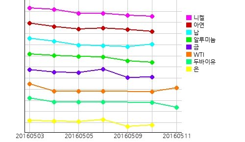 주요광물시세는 납이 전일 대비 톤당 12.3 달러 올라 1749.15 달러를 기록하는 반면, 주석이 전일 대비 톤당 180.5 달러 떨어져 17238.5 달러를 기록했고 니켈, 알루미늄, 아연 모두 하향세를 보였다.