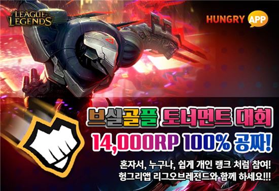 매주 화요일 오후 8시에 온라인으로 펼쳐지는 'LoL 브실골플 토너먼트 대회'는 소환사의 협곡에서 단판 승부로 진행되며, 브론즈와 실버, 골드, 플래티넘 티어 유저라면 누구나 참가할 수 있다. 참가신청은 자신의 ‘리그오브레전드 아이디’와 ‘휴대 전화 번호’를 ‘리그오브레전드 헝그리앱’에 비밀글로 작성하면 된다. 친구와 함께 신청할 경우 참가신청서에 추천인을 표시하면 추천인과 추천 받은 친구 모두에게 헝그리앱 내에서 현금처럼 사용할 수 있는 밥알 포인트를 지급한다.