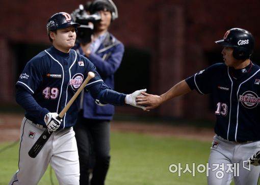 [문학=아시아경제 김현민 기자] 프로야구 두산 베어스와 SK 와이번스의 2016 KBO리그 경기가 11일 인천 문학구장에서 열렸다. 5회초 2사 1루에서 두산 민병헌이 SK 선발 세든을 상대로 우월 투런 홈런을 치고 선행주자 허경민과 하이파이브하고 있다.