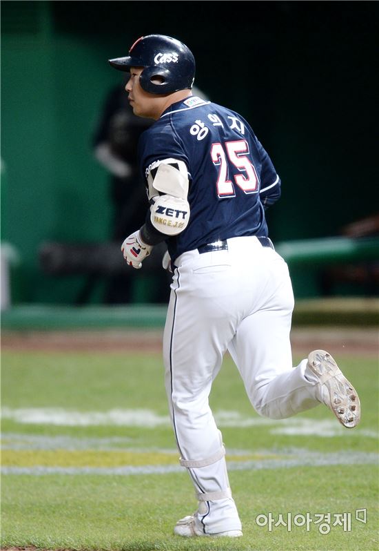 [문학=아시아경제 김현민 기자] 프로야구 두산 베어스와 SK 와이번스의 2016 KBO리그 경기가 11일 인천 문학구장에서 열렸다. 6회초 두산 선두타자 양의지가 SK 선발 세든을 상대로 좌월 연타석 홈런을 치고 타구를 바라보고 있다.