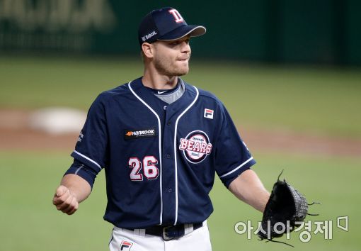 [문학=아시아경제 김현민 기자] 프로야구 두산 베어스와 SK 와이번스의 2016 KBO리그 경기가 11일 인천 문학구장에서 열렸다. 두산 선발투수 보우덴이 6회말 수비를 무실점을 막은 뒤 더그아웃으로 향하고 있다.