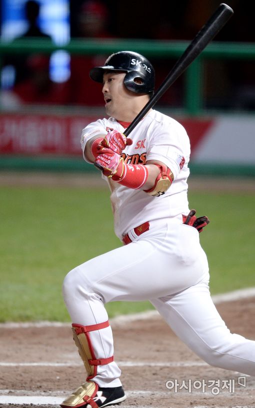 [문학=아시아경제 김현민 기자] 프로야구 두산 베어스와 SK 와이번스의 2016 KBO리그 경기가 11일 인천 문학구장에서 열렸다. 8회말 2사 1,2루에서 SK 정의윤이 1타점 2루타를 치고 있다.