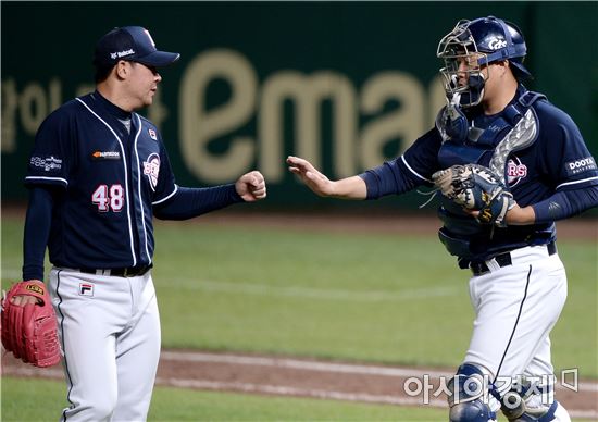 [문학=아시아경제 김현민 기자] 프로야구 두산 베어스와 SK 와이번스의 2016 KBO리그 경기가 11일 인천 문학구장에서 열렸다. 두산 마무리 이현승이 팀의 7-3 승리를 확정한 뒤 양의지 포수와 하이파이브하고 있다.