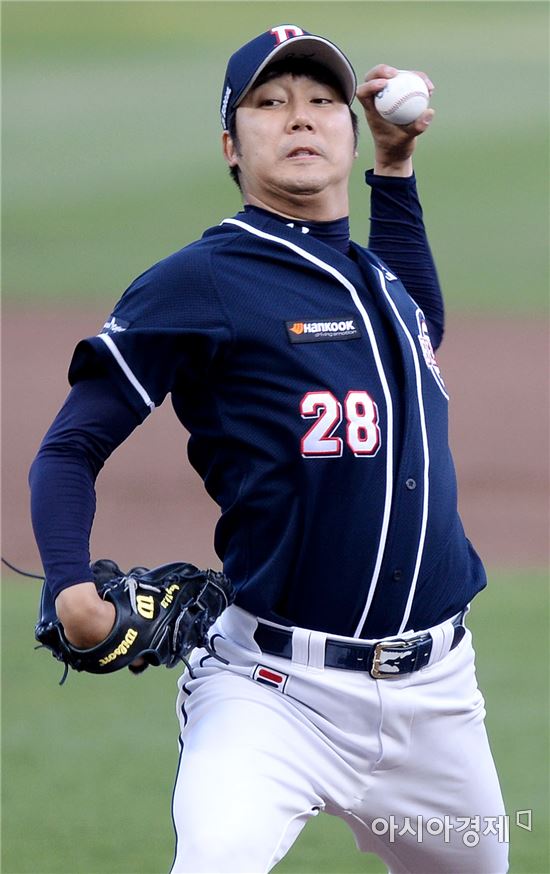 [문학=아시아경제 김현민 기자]프로야구 두산 베어스와 SK 와이번스의 2016 KBO리그 경기가 12일 인천 문학구장에서 열렸다. 두산 선발투수 장원준이 역투하고 있다.