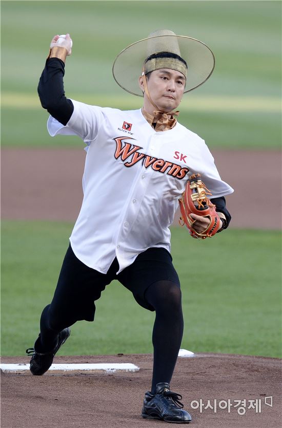 [문학=아시아경제 김현민 기자]프로야구 두산 베어스와 SK 와이번스의 2016 KBO리그 경기가 12일 인천 문학구장에서 열렸다. 남성 듀오 노라조의 조빈이 시구하고 있다.