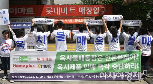 [아시아경제 윤동주 기자] 환경단체연합 등 옥시제품 불매운동 시민단체회원들이 13일 옥시제품을 판매중인 롯데마트 서울역점에서 옥시제품 판매 중단을 촉구하는 기자회견을 갖고 있다.