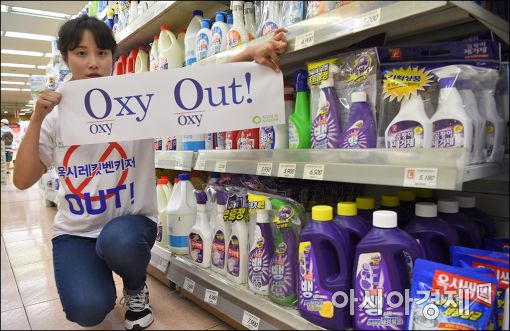 [아시아경제 윤동주 기자] 환경단체연합 등 옥시제품 불매운동 시민단체회원들이 13일 옥시제품을 판매중인 롯데마트 서울역점에서 옥시제품 판매 중단을 촉구하는 퍼포먼스를 갖고 있다.