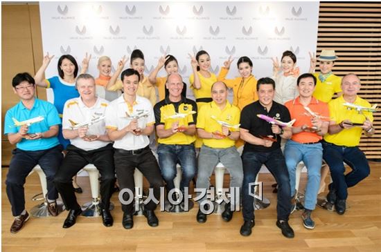 저비용 항공사인 제주항공이 아시아 태평양 및 호주 대표 7개사와 항공 동맹 '벨류 얼라이언스'을 결성했다. 제주항공 최규남 대표이사(앞줄 오른쪽에서 두번째)와 싱가포르, 태국, 호주, 일본, 필리핀 등 8개 항공사 CEO들이 16일 공식 행사를 갖고 기념 촬영을 하고 있다./ [사진제공=제주항공]