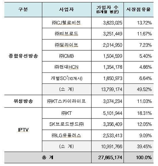 사업자별로는 KT 510만1944명(18.31%), CJ헬로비전 382만3025명(13.72%), SK브로드밴드 335만6409명(12.05%), 티브로드 325만1449명(11.67%), KT스카이라이프 307만4234명(11.03%) 순으로 집계됐다.