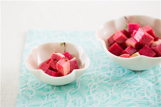 1. 과일무는 깨끗하게 씻어 껍질째 먹기 좋은 크기로 썬다.