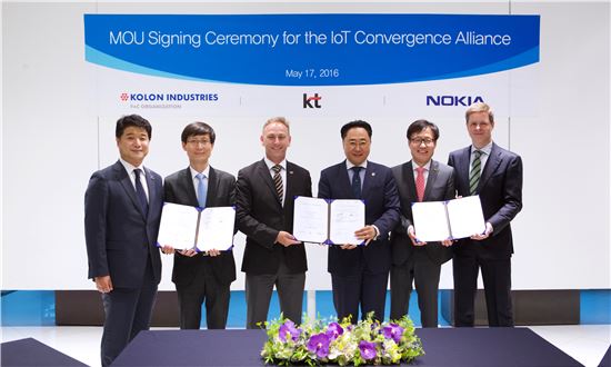 [아시아경제 임혜선 기자]코오롱인더스트리는 17일 서초동 GT타워 5층에서 사물인터넷(IoT)을 기반으로 하는 웨어러블 패션의 공동 연구 및 개발을 위해 KT, 노키아(Nokia)와 상호 양해 각서를 체결했다.