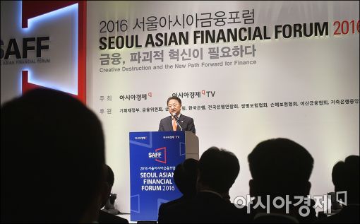 [아시아경제 윤동주 기자] 아시아경제와 아시아경제TV 공동 주최로 23일 서울 중구 조선호텔에서 열린 '2016 서울아시아금융포럼'에 참석한 유일호 경제부총리 겸 기획재정부 장관이 환영사를 하고 있다.