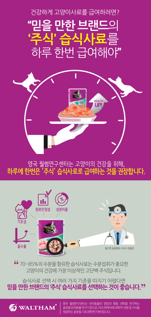 이에 고양이사료 브랜드 ‘위스카스’가 1963년부터 반려동물의 영양과 행동 과학을 연구하며 마즈 펫케어에 과학적 지원 및 지식을 제공하는 글로벌 반려동물 연구기관인 영국 월썸연구센터의 자문을 통해, 현명하게 습식사료를 선택하고 고양이에게 급여하는 방법을 제안해 눈길을 끈다.