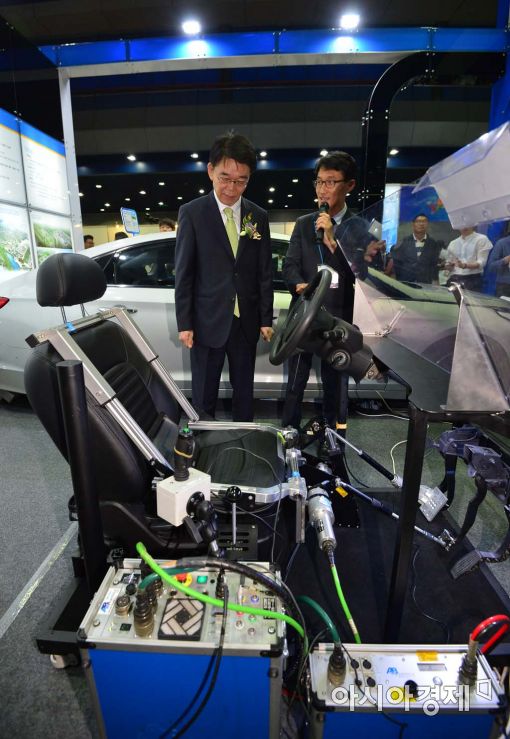 [아시아경제 백소아 기자] 25일 서울 강남구 코엑스에서 열린 2016 국토교통기술대전에서 강호인 국토교통부 장관(왼쪽)이 자율주행차 부스를 둘러보고 있다.