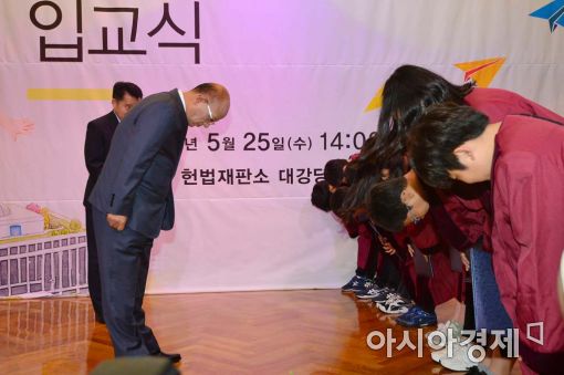 [아시아경제 백소아 기자] 25일 서울 종로구 헌법재판소에서 열린 어린이 헌법교실 입교식에서 박한철 헌법재판소장(왼쪽)이 어린이 참가자들에게 입교증서를 수여한 후 인사하고 있다.