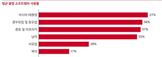평균 불법 소프트웨어의 사용률이 가장 높은 지역은 아시아-태평양 지역으로 2013년 BSA의 조사 결과 대비 1%p감소한 61%를 기록했다.