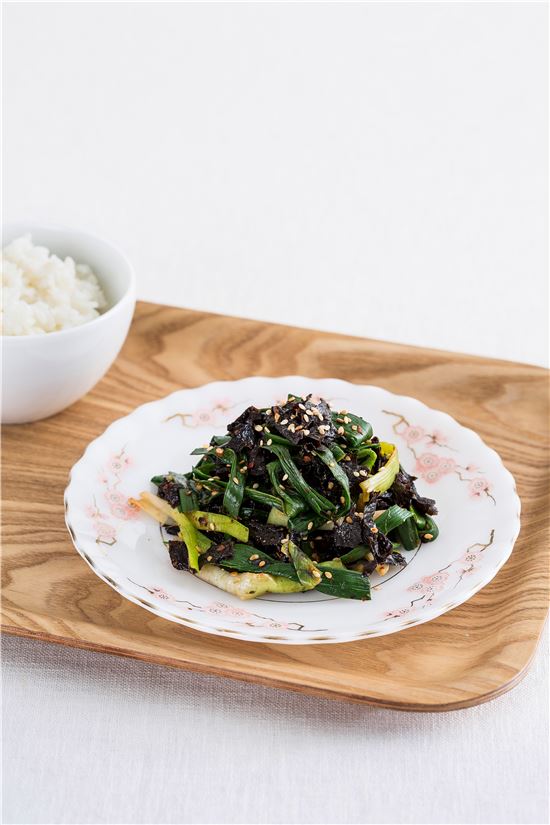 4. 풋마늘대에 양념을 넣어 버무리다가 김을 넣어 가볍게 버무린다.