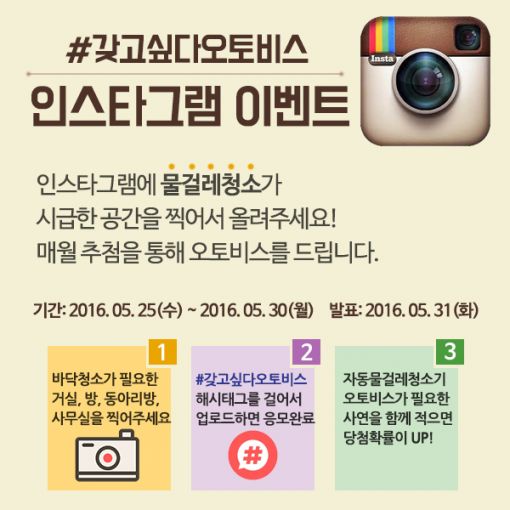 참여방법은 인스타그램에 물걸레청소가 필요한 공간을 사진으로 찍어 #갖고싶다오토비스 해시태그와 함께 올리면 자동으로 응모된다. 응모자 중 3명을 추첨하여 자동물걸레청소기를 증정한다. 당첨자는 31일 오토비스 공식 페이스북(www.facebook.com/ksautovis) 및 인스타그램을 통해 확인할 수 있다.