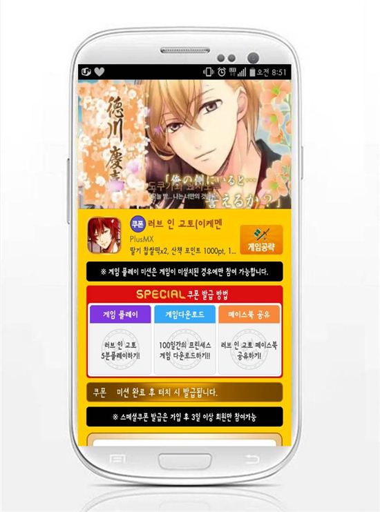 이번에 지급하는스페셜쿠폰은 모바일판타지 시뮬레이션 게임‘러브인교토(이케멘 막말)’ 쿠폰으로 등록하면 딸기 찹쌀떡 2개와 1천 산책 포인트, 1천 냥을지급한다.